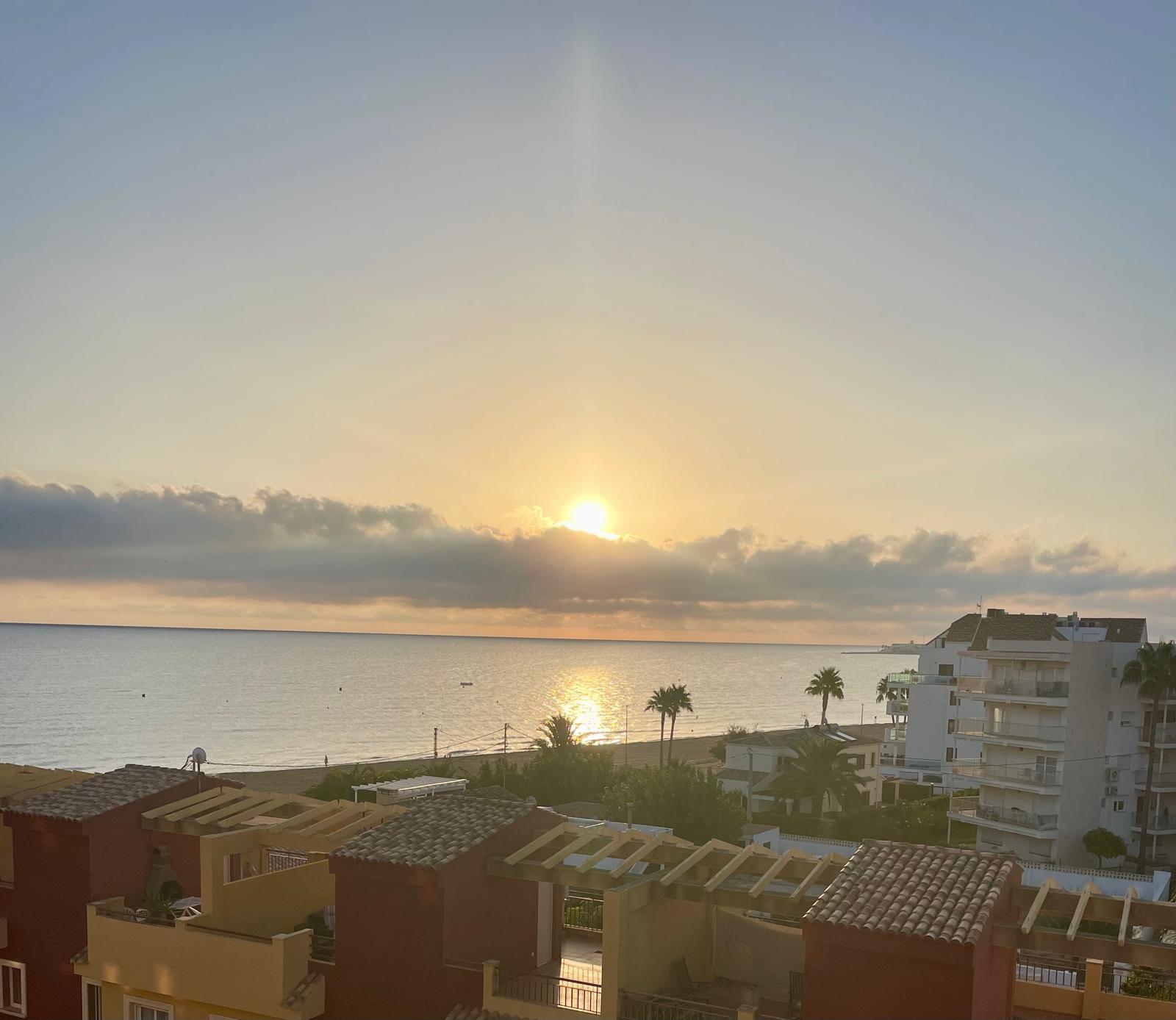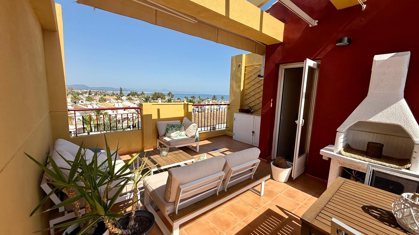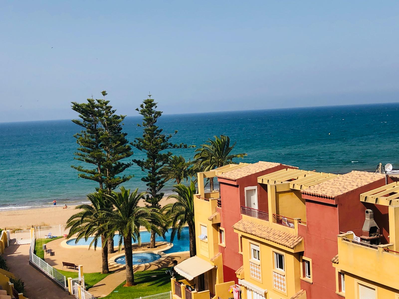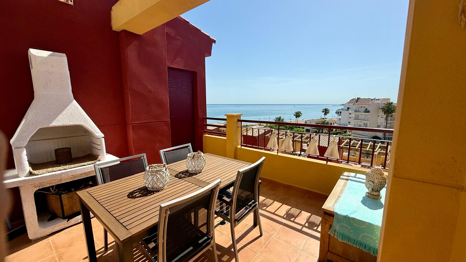 This attractive penthouse is located on the beachfront, in a privileged location. It has 2 bedrooms with fitted wardrobes, 2 bathrooms, a kitchen integrated into the living room, a living room with access to a perfectly located terrace with sea views, parking, air conditioning with heat pump, a large solarium with beautiful views in several directions and a barbecue.