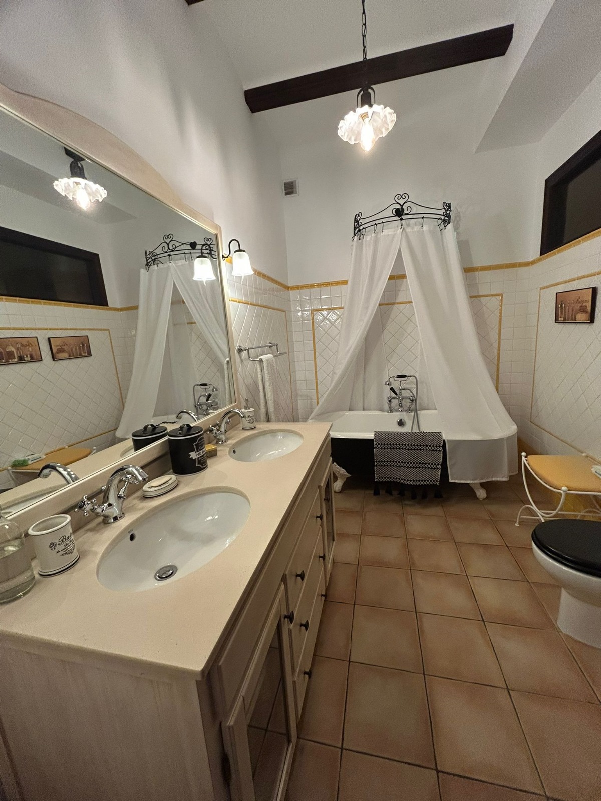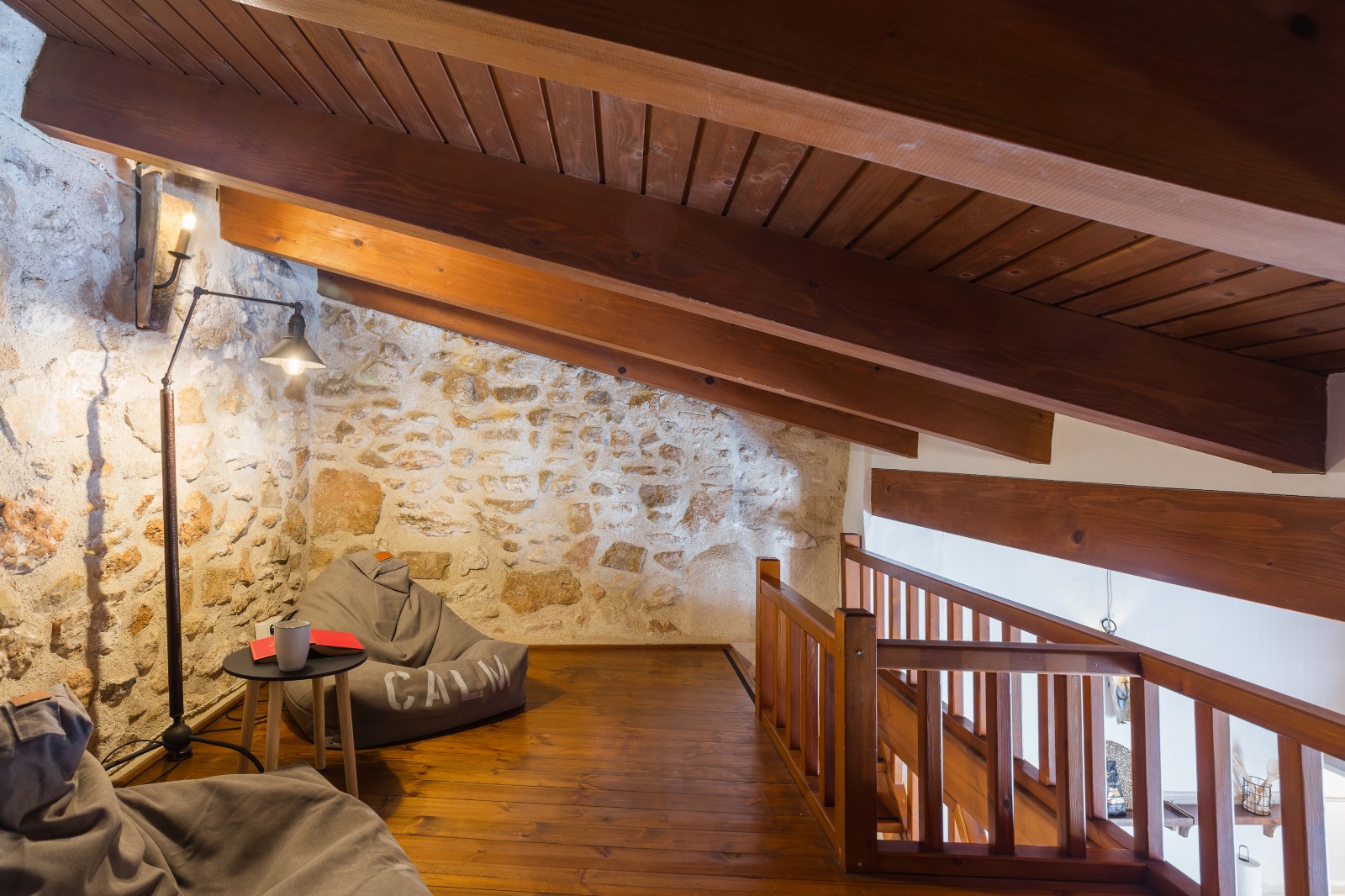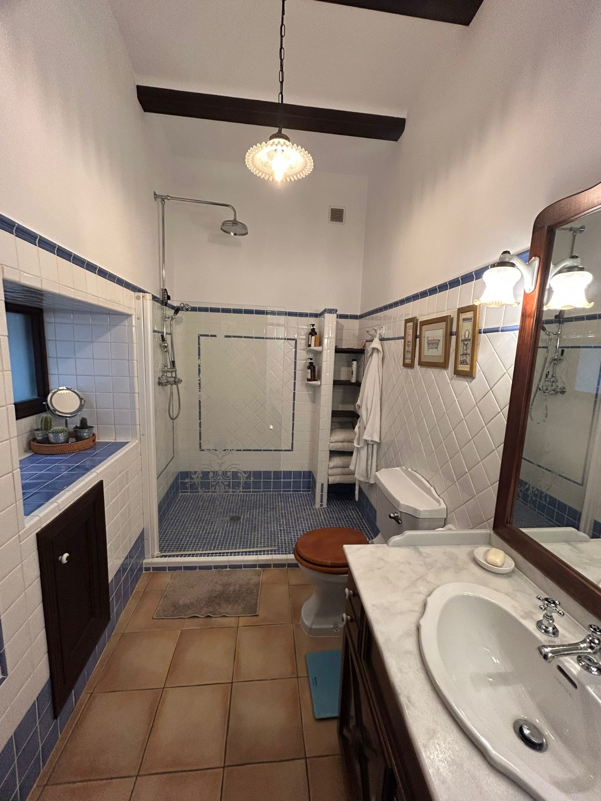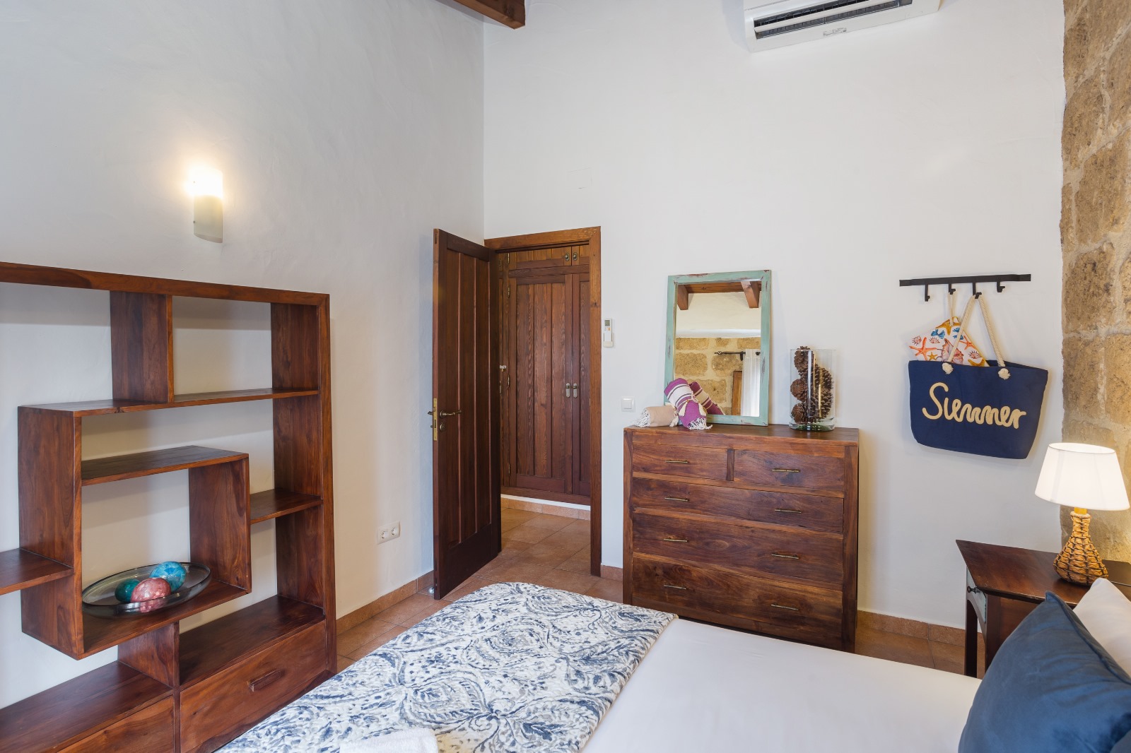 The first floor features a cozy landing area, three double bedrooms — one of which is currently used as a dressing room — and two full bathrooms. The master bedroom is especially charming, with balconies overlooking the patio, a dressing room, and a luxurious en-suite bathroom.
