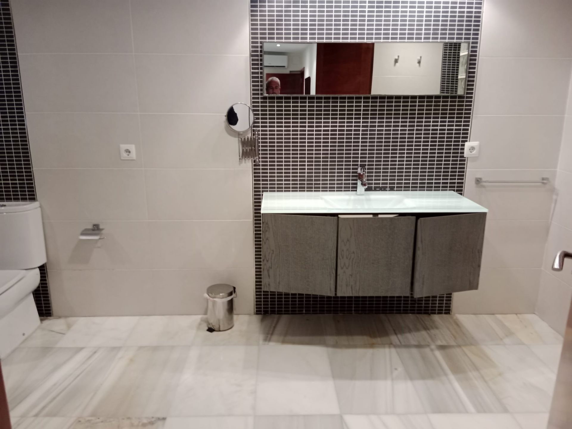 Ground floor: Spacious living/dining room with fireplace, independent fully equipped kitchen, two bedrooms, two bathrooms, laundry room, and access to an open terrace with east-facing views. The villa is equipped with air conditioning, gas central heating, and natural gas hot water.